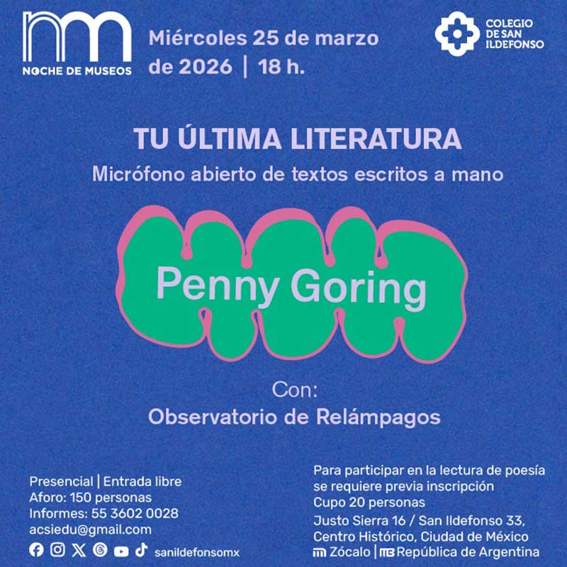 En el margen de la exposición Penny Goring: Unloving Love / El desamor del amor, el colectivo de poesía Observatorio de Relámpagos convoca a Tu última literatura, un micrófono abierto de textos escritos a mano; un evento que busca darle lugar a todos esos escritos y rayones que nacieron ocupando uno de los espacios que, dada su materialidad tan cotidiana, hoy es relegado a una condición de borrador o desecho personal: el papel. Queremos juntarnos a compartir entradas de diario, cartas de amor (atesoradas o repudiadas), las notas en sus libretas y todo texto que, en vez de existir como píxel, habita como un objeto más en nuestros cuadernos, cuartos y días.
