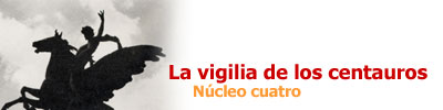 | La vigilia de los centauros versa sobre el encuentro de dos formas de representaciones ecuestres: la escultura monumental y la fotografía de ésta. La intención primera de la escultura ecuestre es la de asegurar la memoria de su jinete o sus hazañas, intención que se pierde en el tiempo, para olvidarse del sujeto y convertirse en un icono urbano. En esta sala se proyecta el video El testigo de Luis Lupone, que hace un recorrido histórico urbano de la escultura de Calos IV, conocida actualmente como "El Caballito". Un video trabajado a partir de piezas fotográficas que comentan los traslados que ha sufrido la escultura y destaca los principales escenarios sociales que le ha tocado atestiguar. |