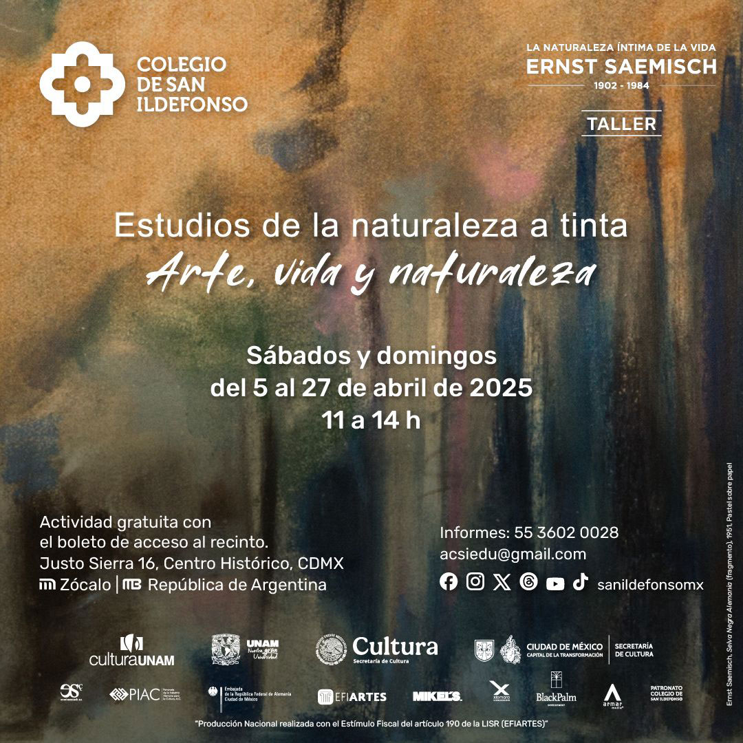 El taller Estudios de naturaleza a tinta. Arte, vida y naturaleza, coordinado por (falta), abre la oportunidad de que los participantes conozcan y reinterpreten la obra del artista alemán Ernst Saemisch haciendo ejercicios de tinta sobre papel artístico, todos los fines de semana de enero a mayo de 2025.