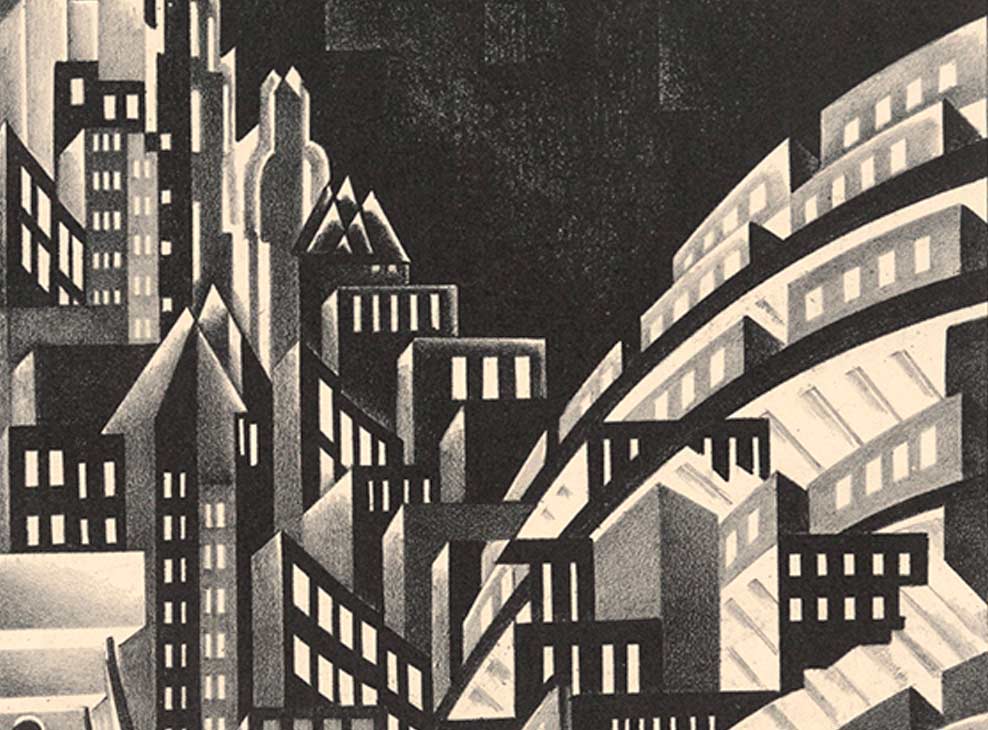 Mirando hacia arriba, mirando hacia abajo Las imágenes de los imponentes edificios de Nueva York, frecuentemente abstractas, idealizadas y a veces inhabitadas, demuestran el ambiente de optimismo utópico del periodo de auge económico que siguió al final de la Primera Guerra Mundial. A nivel de lo cotidiano, los artistas eran atraídos por los concurridos lugares de entretenimiento popular –cines, espectáculos de cabaret, peleas de box– y por las penas de los inmigrantes recién llegados o los indigentes que ocupaban los espacios más marginales de la metrópolis: a orilla del río y debajo de los puentes o los rieles elevados de los trenes.